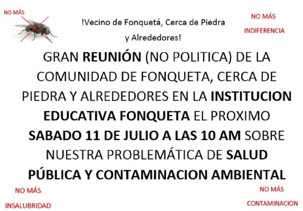 El Comité de Fonquetá, Cerca de Piedra y alrededores, está convocando para mañana a las 10:00 de la mañana, una reunión para tratar sobre la situación ambiental y de salud, en que se encuentra la vereda desde que inició su lucha contra la plaga de moscas, que sigue afectando a buena parte de la comunidad.