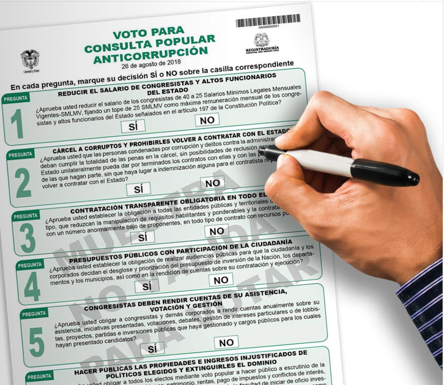 El tarjetón del plebiscito trae 7 preguntas a las que se puede votar SI o NO en cada una de ellas.