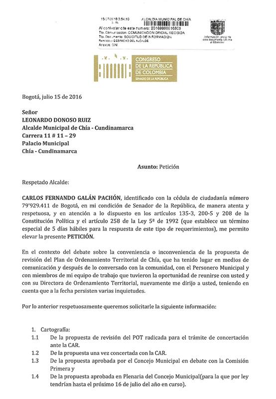 1 comentario en “Senador Carlos Fernando Galán sigue inquieto con el POT de Chía y en su recta final, radica derecho de petición”