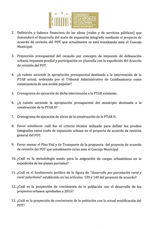 El derecho de petición termina pidiendo explicación de cómo cubrirá el municipio el déficit de redes de acueducto y alcantarillado, vías, cupos escolares y atención en salud para los proyectos urbanísticos aprobados en el 2015.