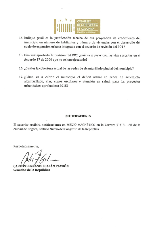 Después de esta reunión, el senador Galán radicó este viernes 15 de julio un derecho de petición en que le solicita al alcalde a través de 17 puntos, varios documentos e información relacionada con la cartografía del POT, entre ellos la propuesta de revisión del POT tramitada para la concertación ante la CAR; la propuesta una vez concertada ante la CAR; la propuesta aprobada por el concejo municipal en debate con la comisión primera y la propuesta aprobada en plenaria por el concejo municipal.